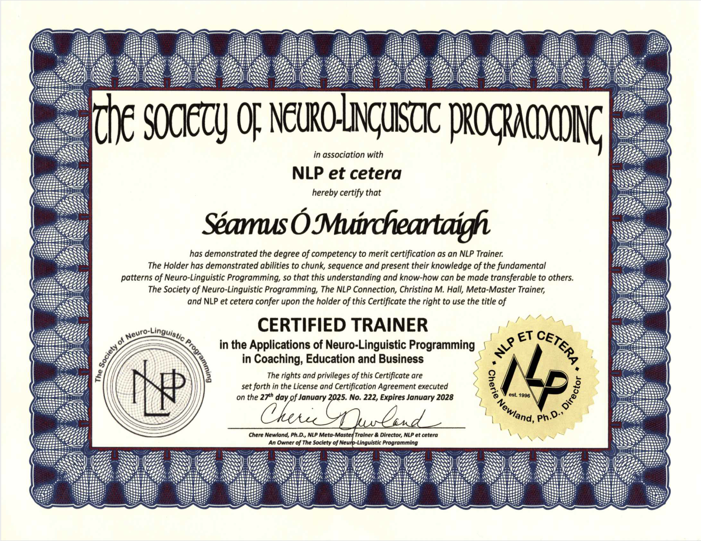 He is a Certified Trainer in the Applications of NLP in Coaching, Education, and Business through Cherie Newland, a co-owner of the Society of NLP and Christina Hall, Meta-Master NLP Trainer. See Séamus’ NLP Trainer certificate.